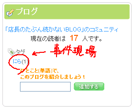 とはよく言われる理想の目標ですが、皆様いかがお過ごしでしょうか(What 店長は某BLOGコミュニティサイトに一応登録しているのですが 言わずもがなこの半年間放置していたわけで('A`) プロフィール画像として使えそうな絵をせっかく描いたので 登録内容の更新も兼ねて、久しぶりにコミュニティサイトに赴いてみました。 さすがに半年も放置すると色々仕様が変わっていたり 店長同様 行方不明になっていらっしゃる方も見受けられたりで以下略でした。 そして何やら新たな機能として 『タグ』 が付けられるようになった模様。 "ひとこと(単語)で、このブログを紹介しましょう!” とはまた無理をおっしゃる('A`) 早速 『にら』 で登録してみましたところ 他に誰一人として仲間が居りませんでしたよ('A`) |