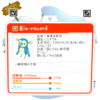 大きさは最小。見た目は初代を受け継ぐ方向で。 レベルはこだわらないつもりなんだけど、一応70を目標にしておこうかと。 目標達成よりも、まず長生きする事を第一にした方が良さげ。 |